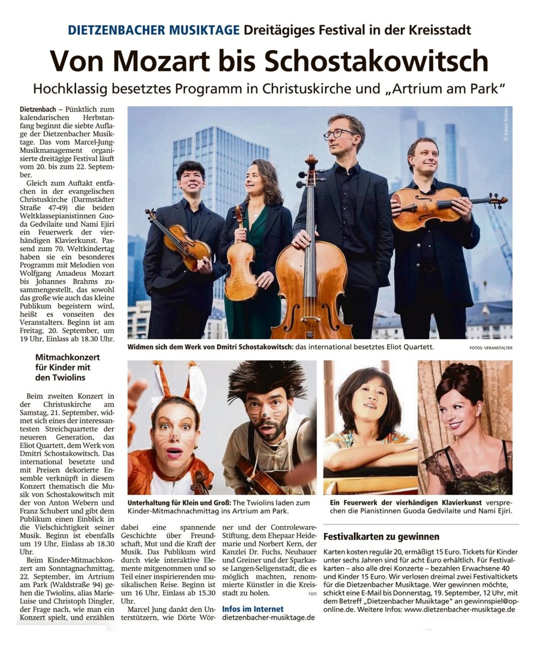 die Dietzenbacher Musiktage dürfen natürlich auch im Jubiläumsjahr der Kreisstadt Dietzenbach nicht fehlen. Besonders freut es mich, dass diese erfolgreiche Konzertreihe selbst ihr erstes